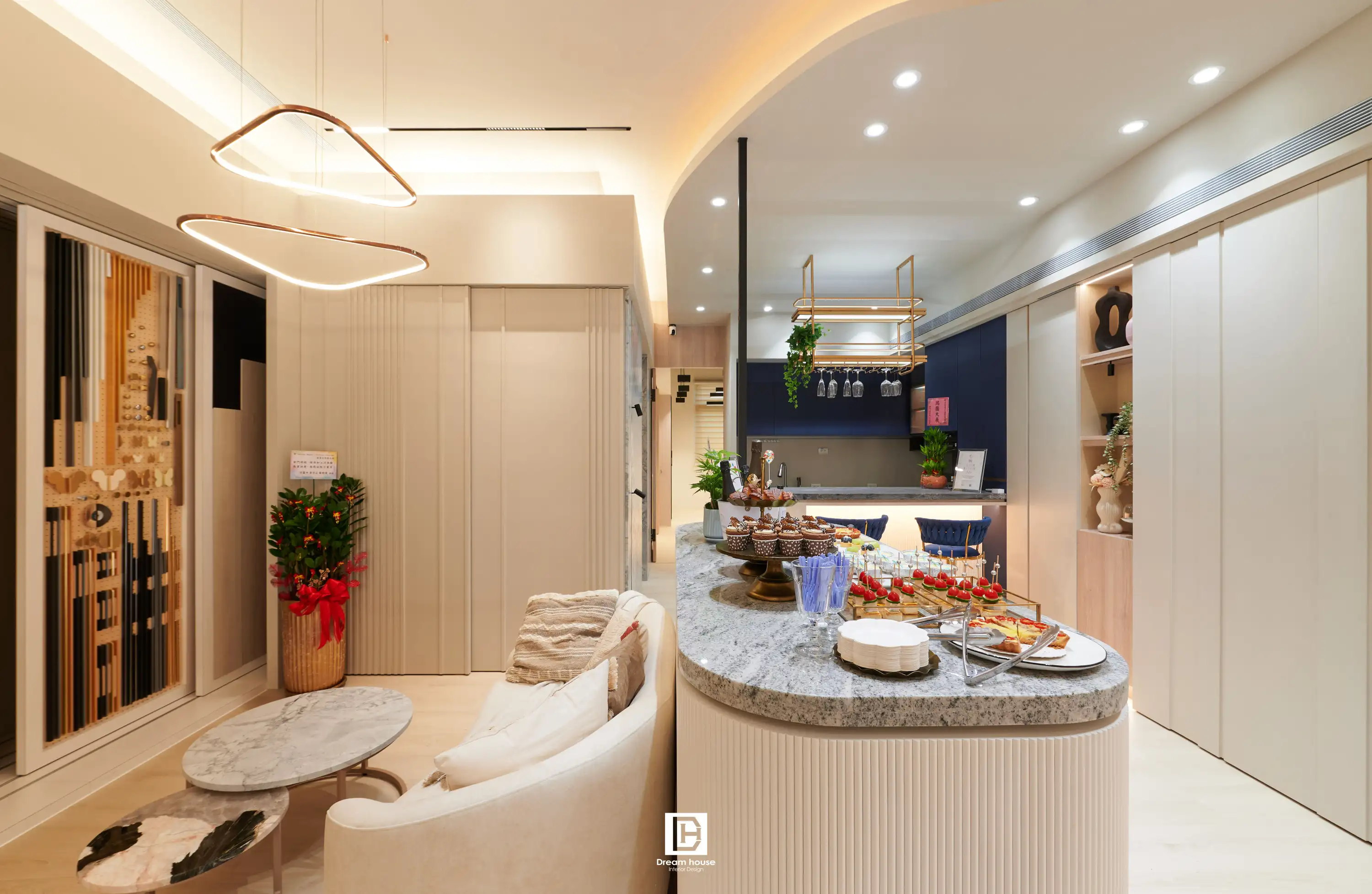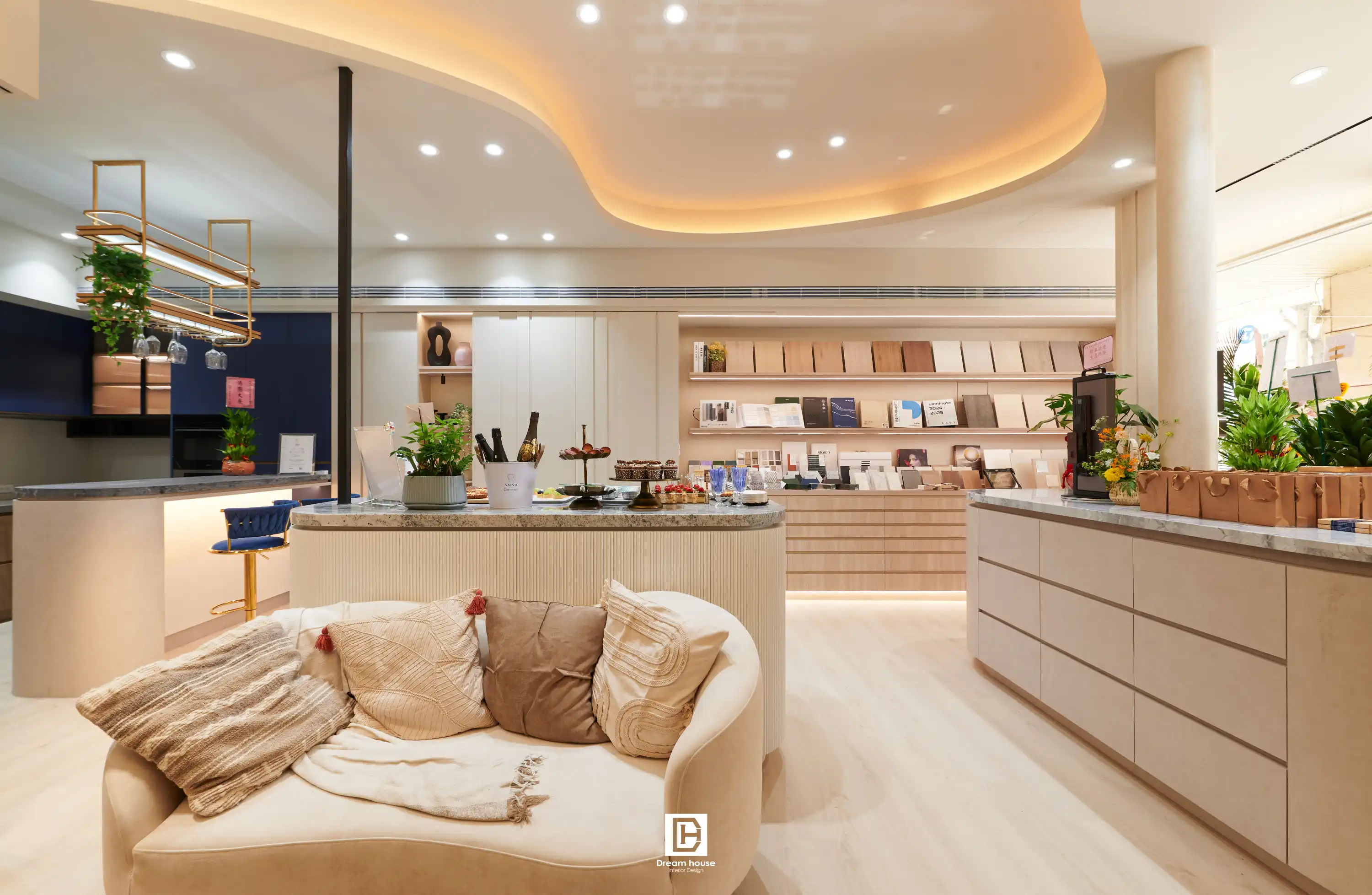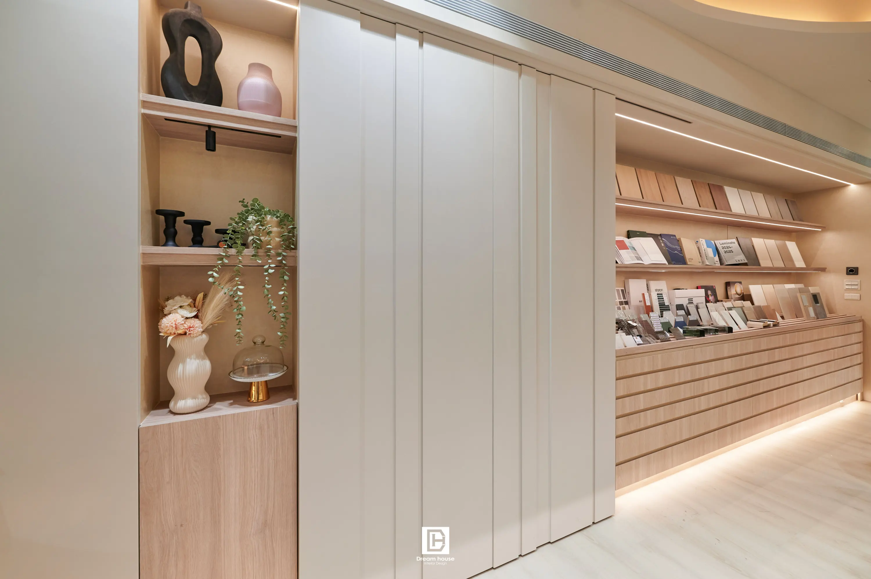 四房以上, 奶油風, 最新消息, 風格介紹 雋好室|擁有建材庫的室內設計公司 2025-10-13 發佈由 雋好室 09 10 月 免費諮詢 雋好室|擁有建材庫的室內設計公司 桃園市|商業空間|奶油風 坪數 坪數 30坪 30坪 房屋格局 房屋格局 開放空間 開放空間 常用材料 常用材料 美耐板 / 油漆 / 鏡面 / 系統櫃 美耐板 / 油漆 / 鏡面 / 系統櫃 配色選擇 配色選擇 奶茶 / 石紋 / 膚感紋理 奶茶 / 石紋 / 膚感紋理 家具搭配 家具搭配 貓抓皮 / 蜂巢簾 / 夢幻簾 貓抓皮 / 蜂巢簾 / 夢幻簾 不同於傳統設計公司,雋好室擁有自家的建材庫。 我們相信設計不該停留在電腦螢幕上,而是要讓客人「摸得到、看得到、感受得到」。 桃園店的展間因此以「五感體驗」為主軸: 前區展示各式建材、五金、配件,每一個細節都能觸摸、比較、搭配。 左側奢石展示區,呈現天然紋理與光影的變化。 右側系統板件牆,展示不同材質與工藝質感。 門口背牆使用我們自家代理的藝術塗料,讓人一進門就感受空間的層次。 中島櫃中藏有驚喜 —— 打開後滿滿的五金把手、鉸鍊與細節設計,展現我們對品質的堅持。