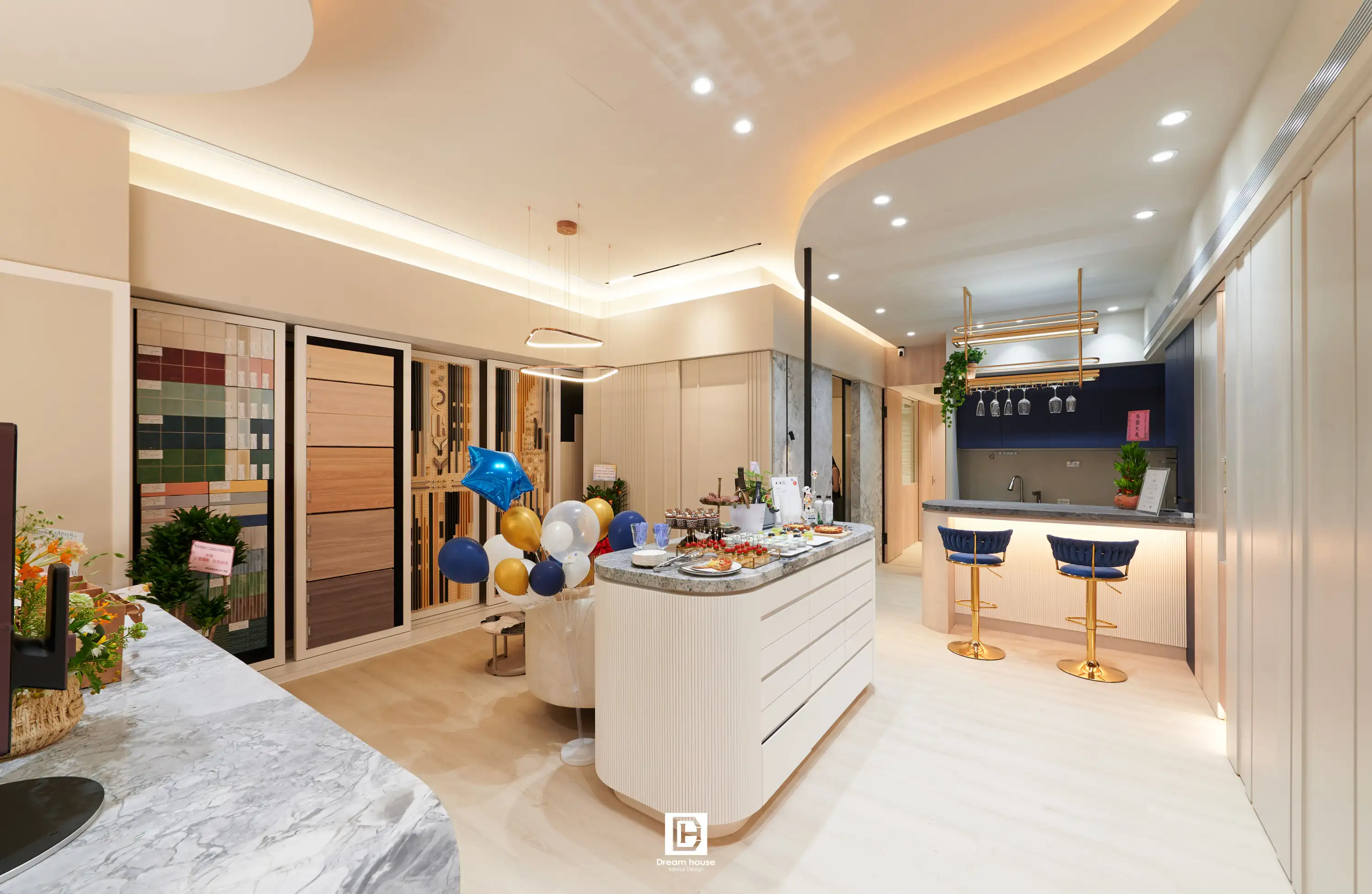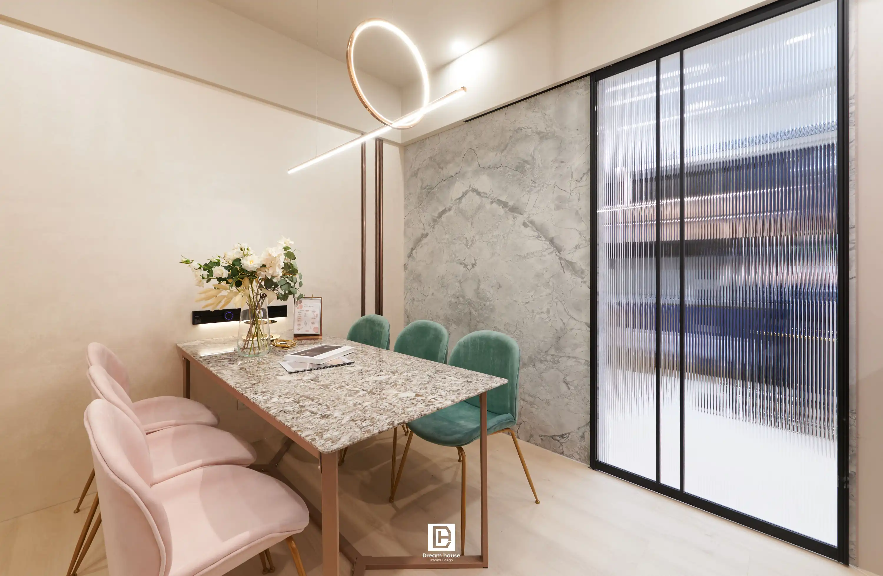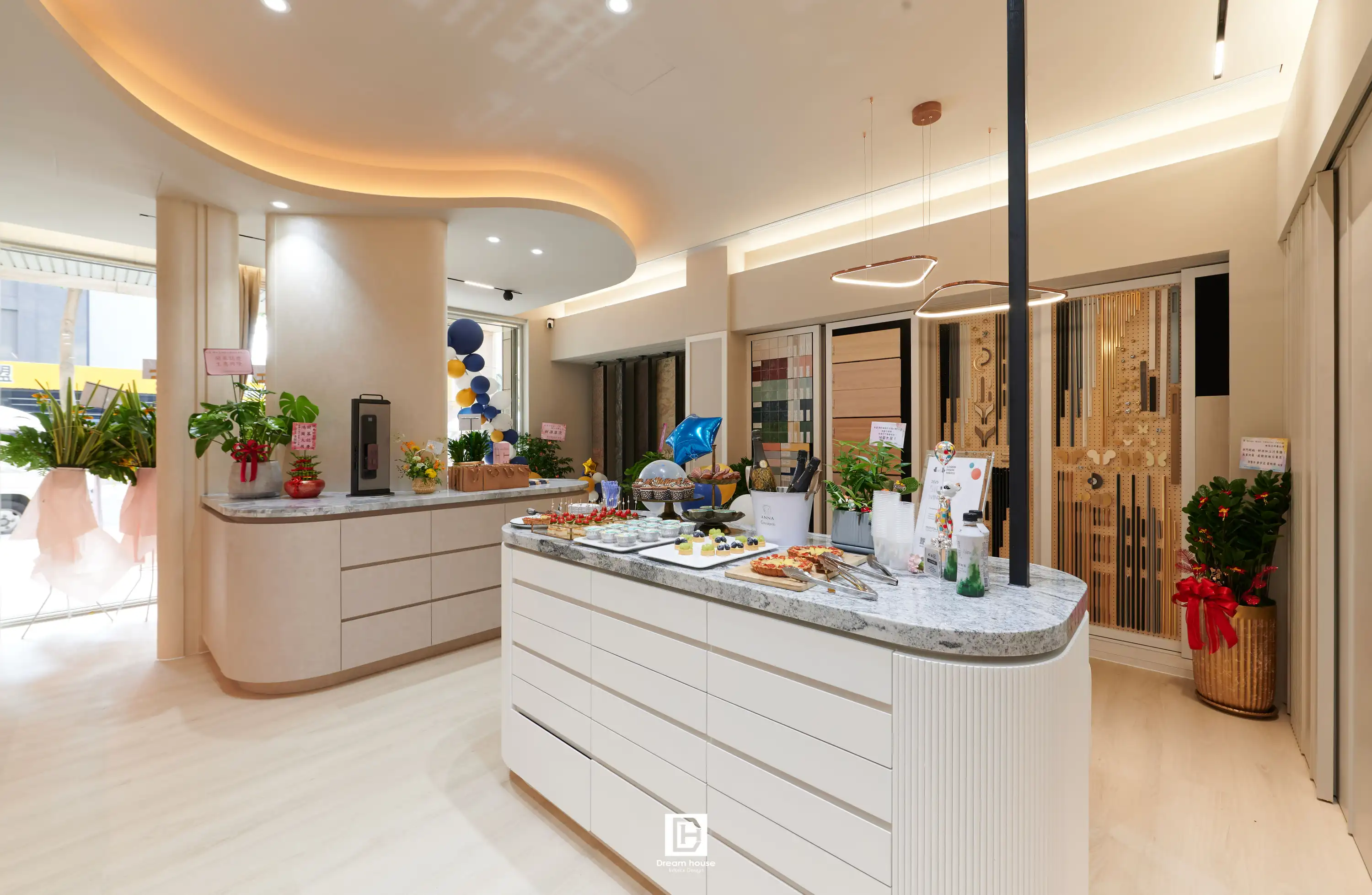 四房以上, 奶油風, 最新消息, 風格介紹 雋好室|擁有建材庫的室內設計公司 2025-10-13 發佈由 雋好室 09 10 月 免費諮詢 雋好室|擁有建材庫的室內設計公司 桃園市|商業空間|奶油風 坪數 坪數 30坪 30坪 房屋格局 房屋格局 開放空間 開放空間 常用材料 常用材料 美耐板 / 油漆 / 鏡面 / 系統櫃 美耐板 / 油漆 / 鏡面 / 系統櫃 配色選擇 配色選擇 奶茶 / 石紋 / 膚感紋理 奶茶 / 石紋 / 膚感紋理 家具搭配 家具搭配 貓抓皮 / 蜂巢簾 / 夢幻簾 貓抓皮 / 蜂巢簾 / 夢幻簾 不同於傳統設計公司,雋好室擁有自家的建材庫。 我們相信設計不該停留在電腦螢幕上,而是要讓客人「摸得到、看得到、感受得到」。 桃園店的展間因此以「五感體驗」為主軸: 前區展示各式建材、五金、配件,每一個細節都能觸摸、比較、搭配。 左側奢石展示區,呈現天然紋理與光影的變化。 右側系統板件牆,展示不同材質與工藝質感。 門口背牆使用我們自家代理的藝術塗料,讓人一進門就感受空間的層次。 中島櫃中藏有驚喜 —— 打開後滿滿的五金把手、鉸鍊與細節設計,展現我們對品質的堅持。