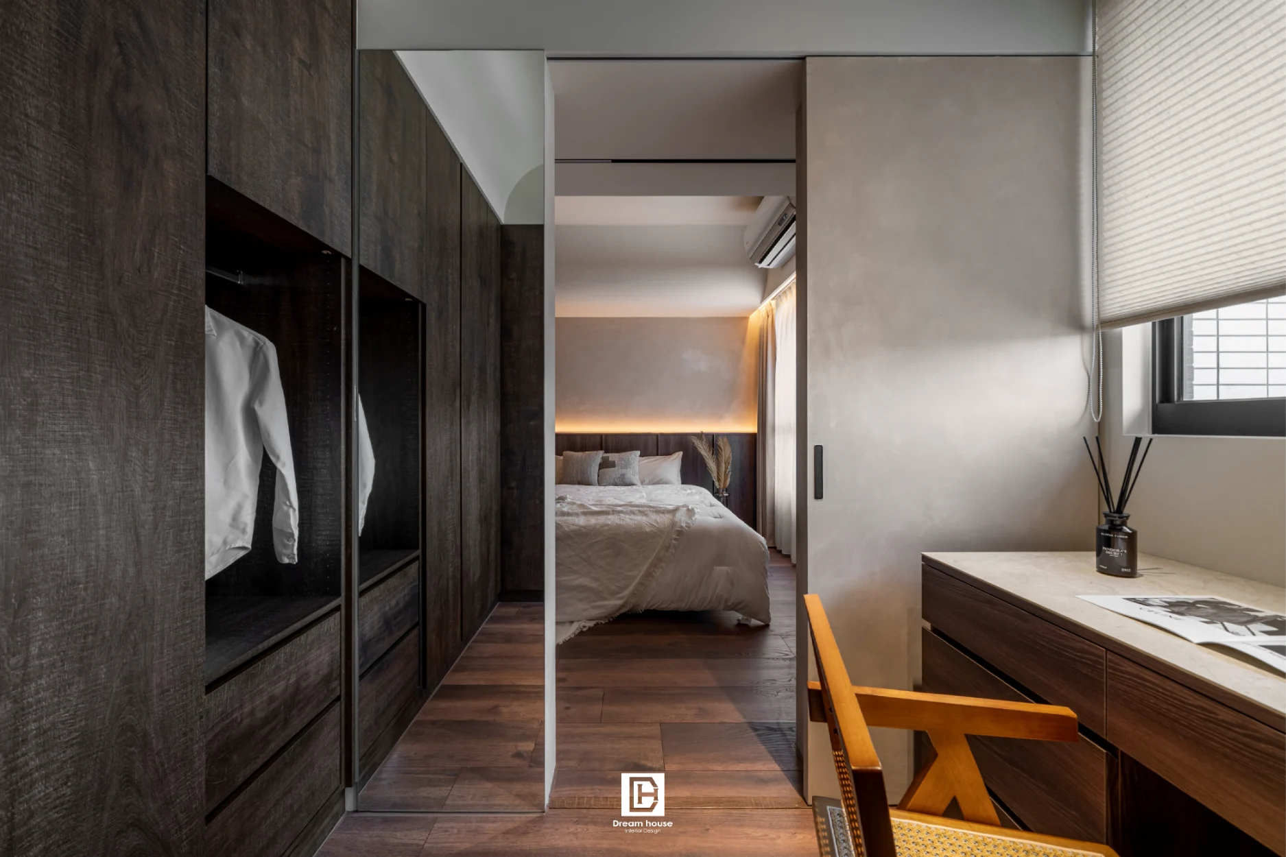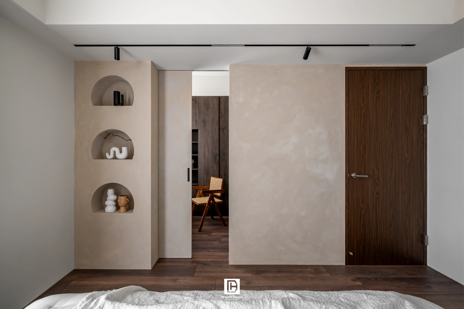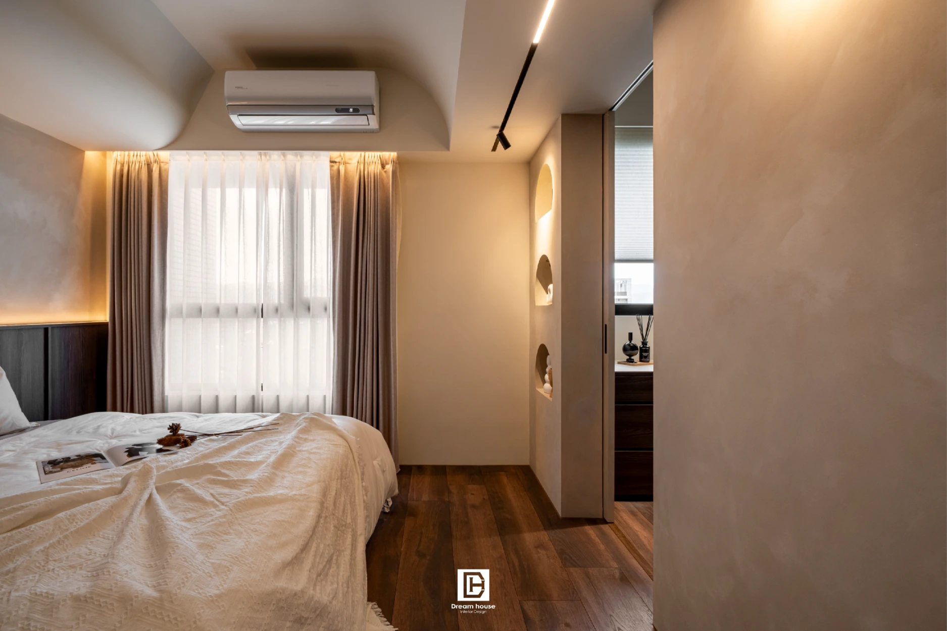 臥室天花以木作弧形包樑處理,搭配浴室隱藏門與造型壁龕,巧妙收納工作區,使主臥更具風格與沉靜氛圍。