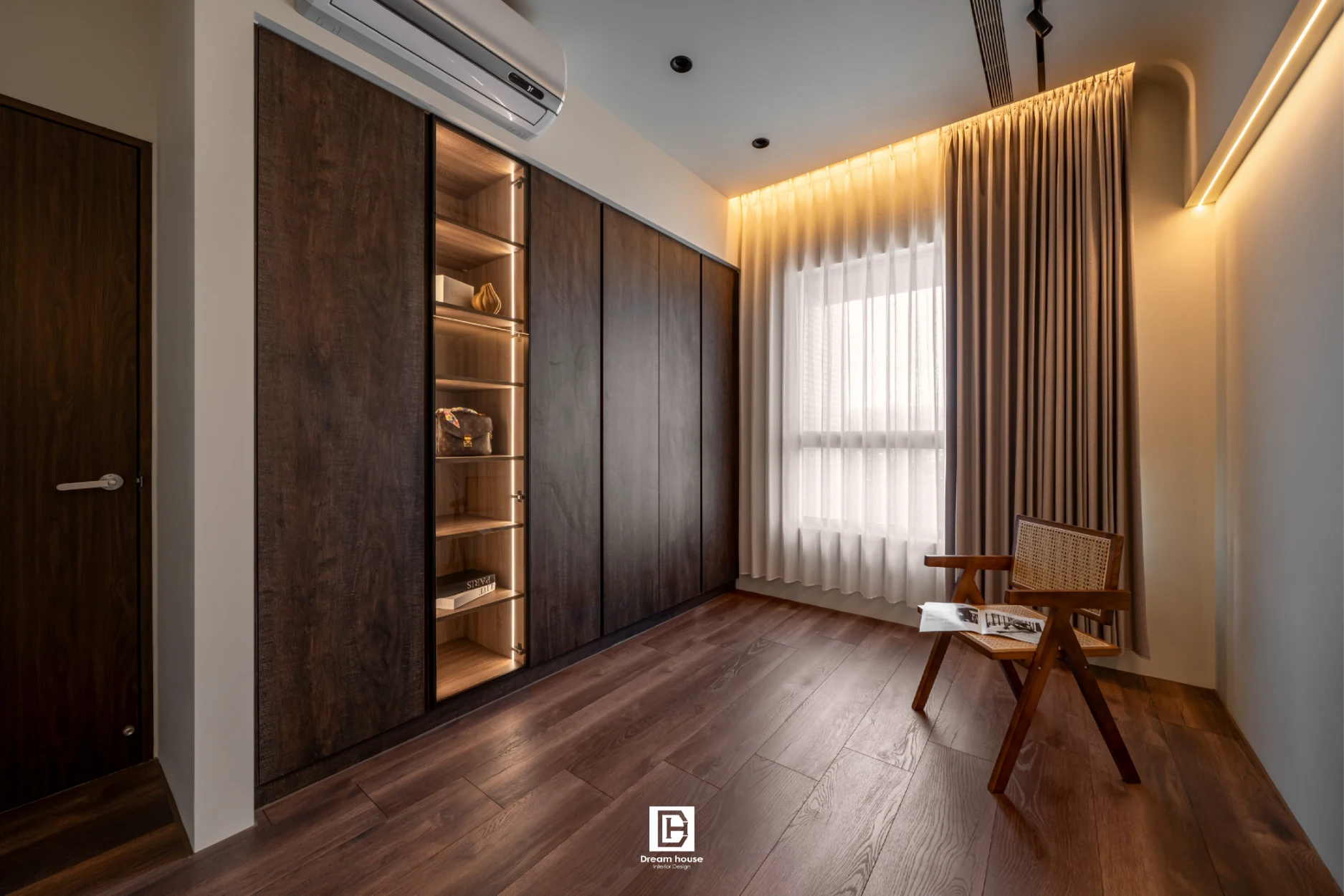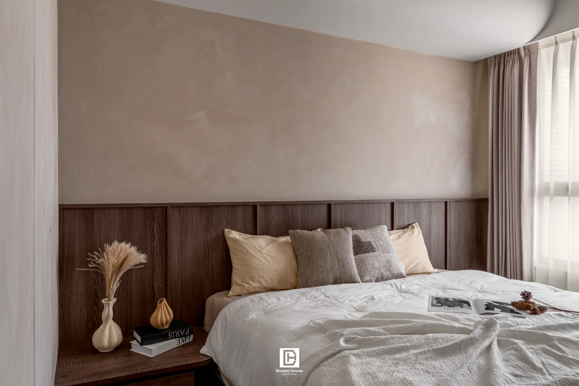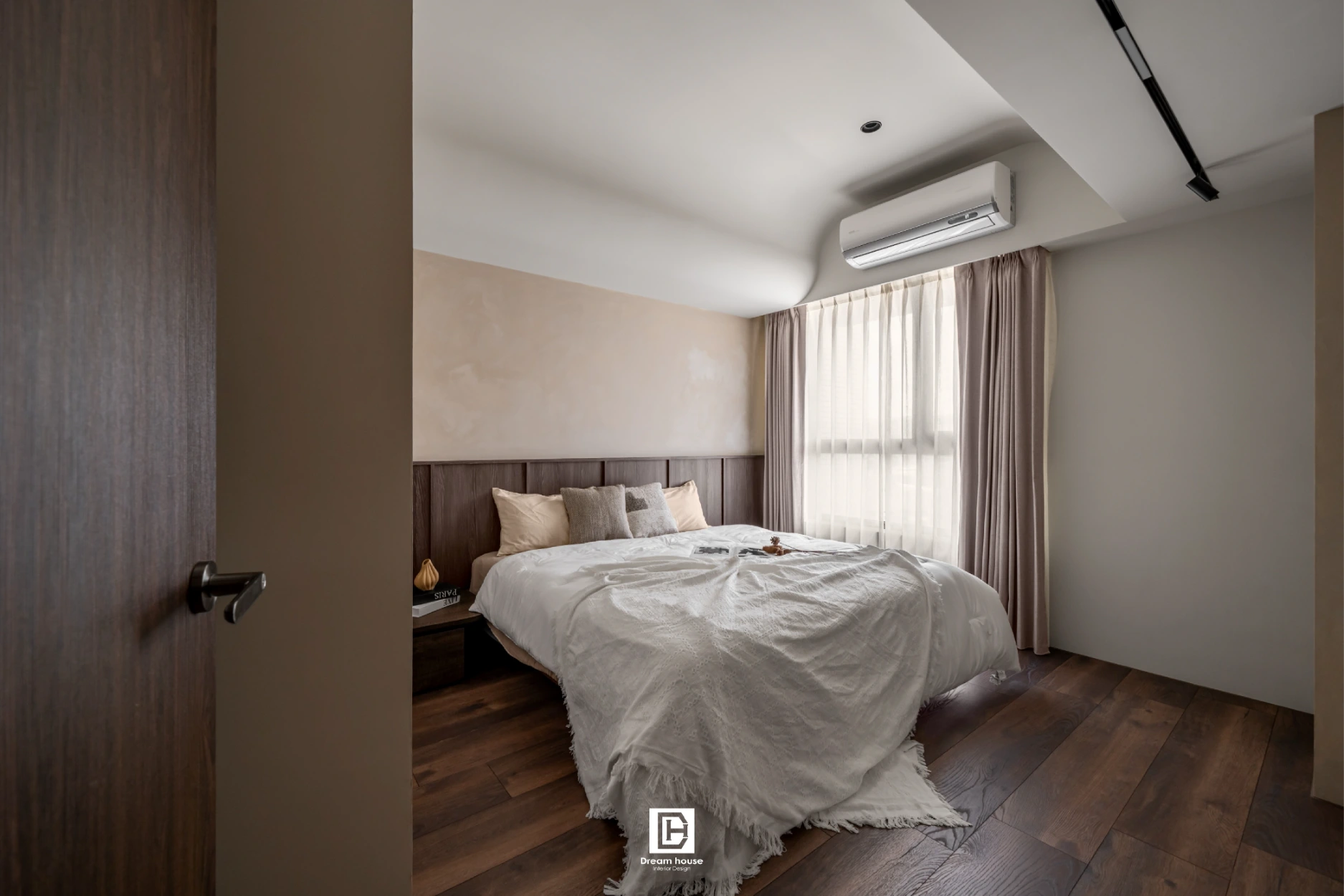 臥室天花以木作弧形包樑處理,搭配浴室隱藏門與造型壁龕,巧妙收納工作區,使主臥更具風格與沉靜氛圍。