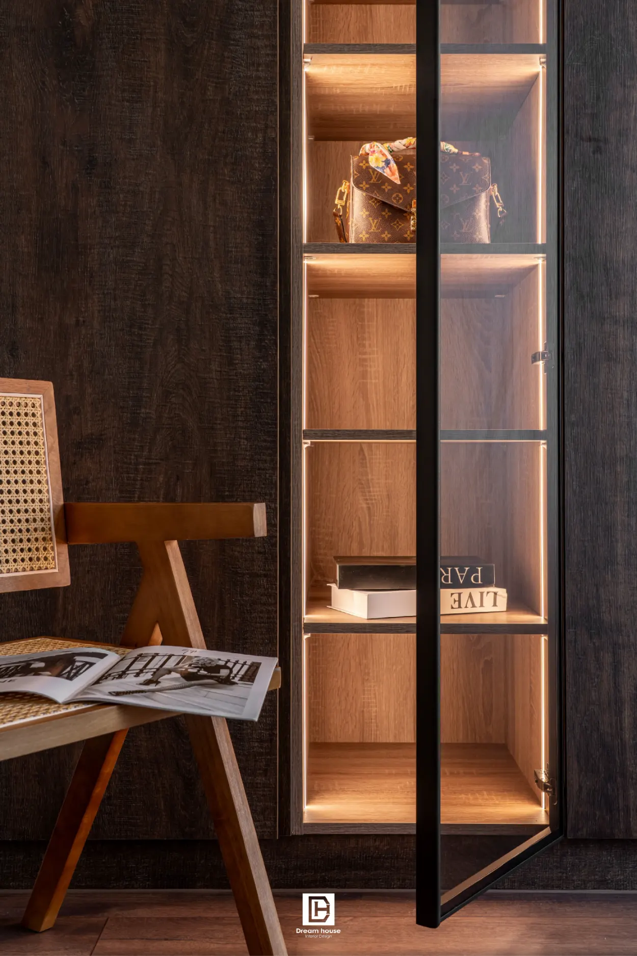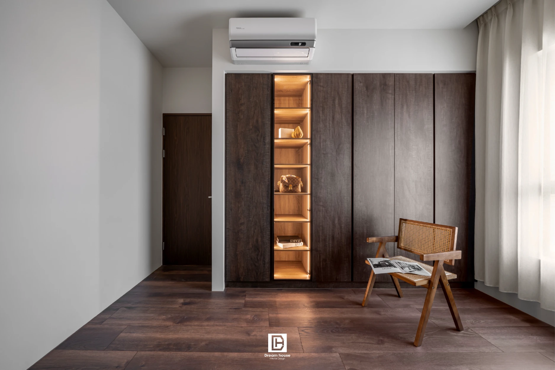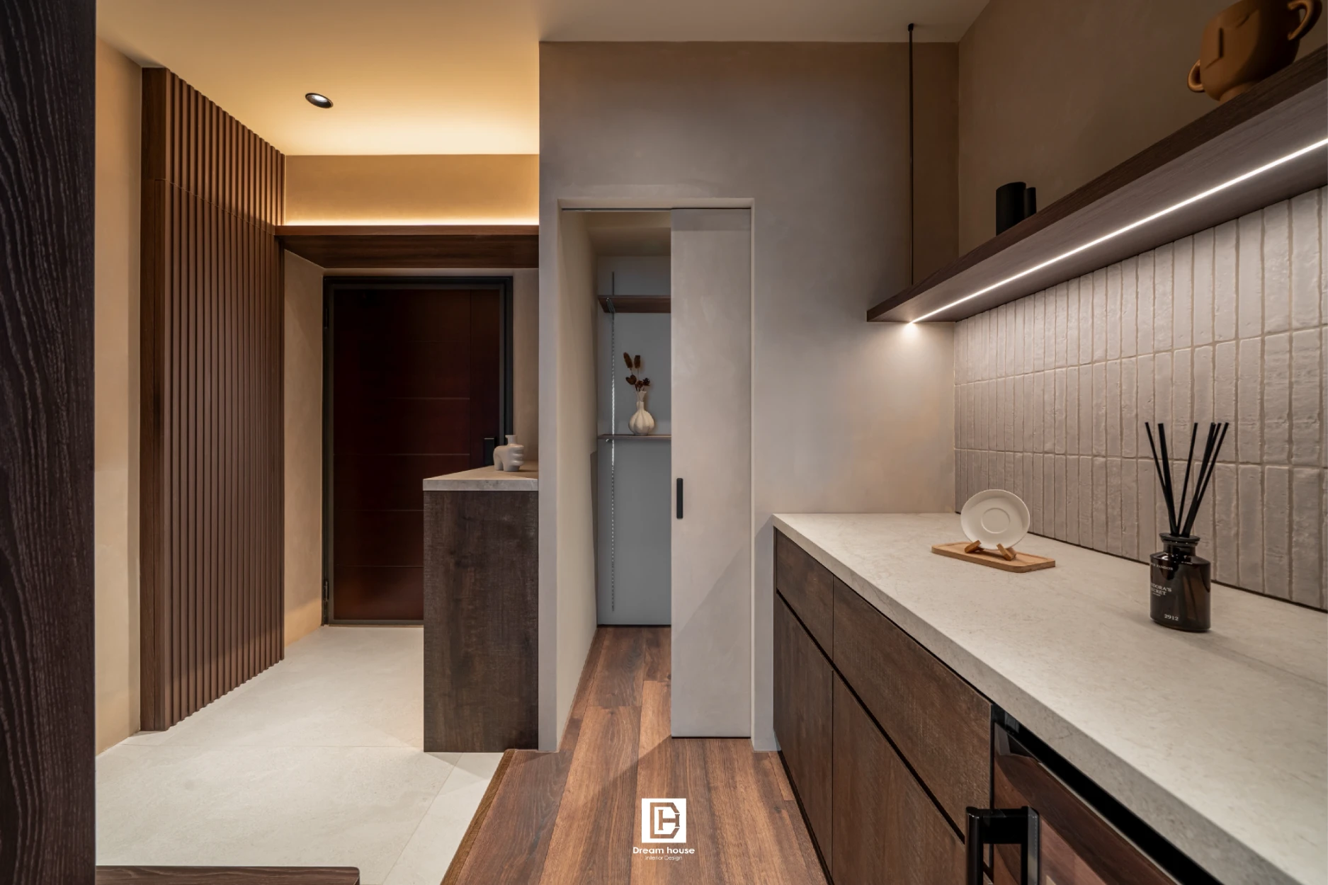 因居住人口僅兩人,室內規劃在強調侘寂風格的同時,也納入充足收納:玄關旁設置儲藏室,主臥配置步入式衣帽間。