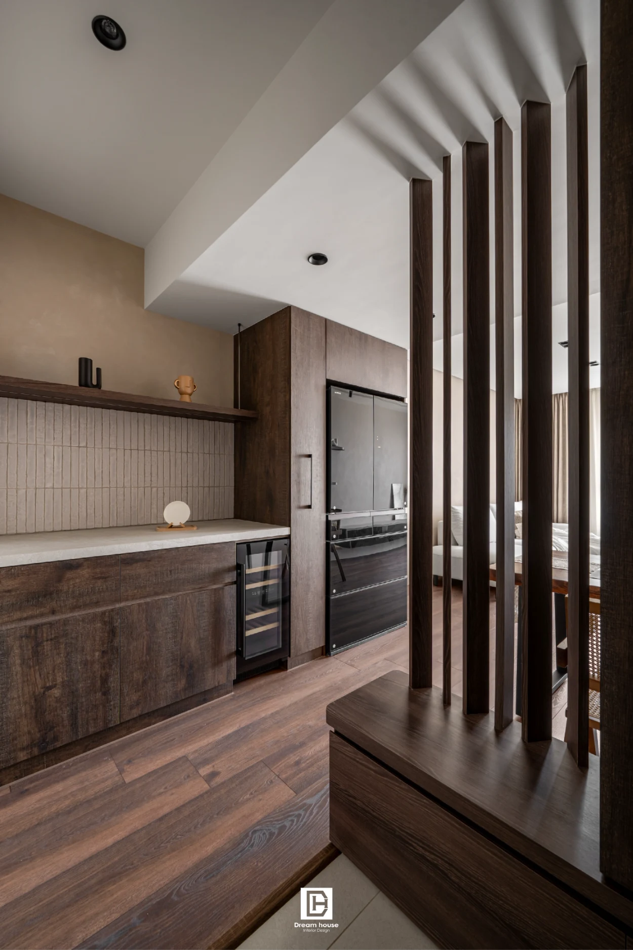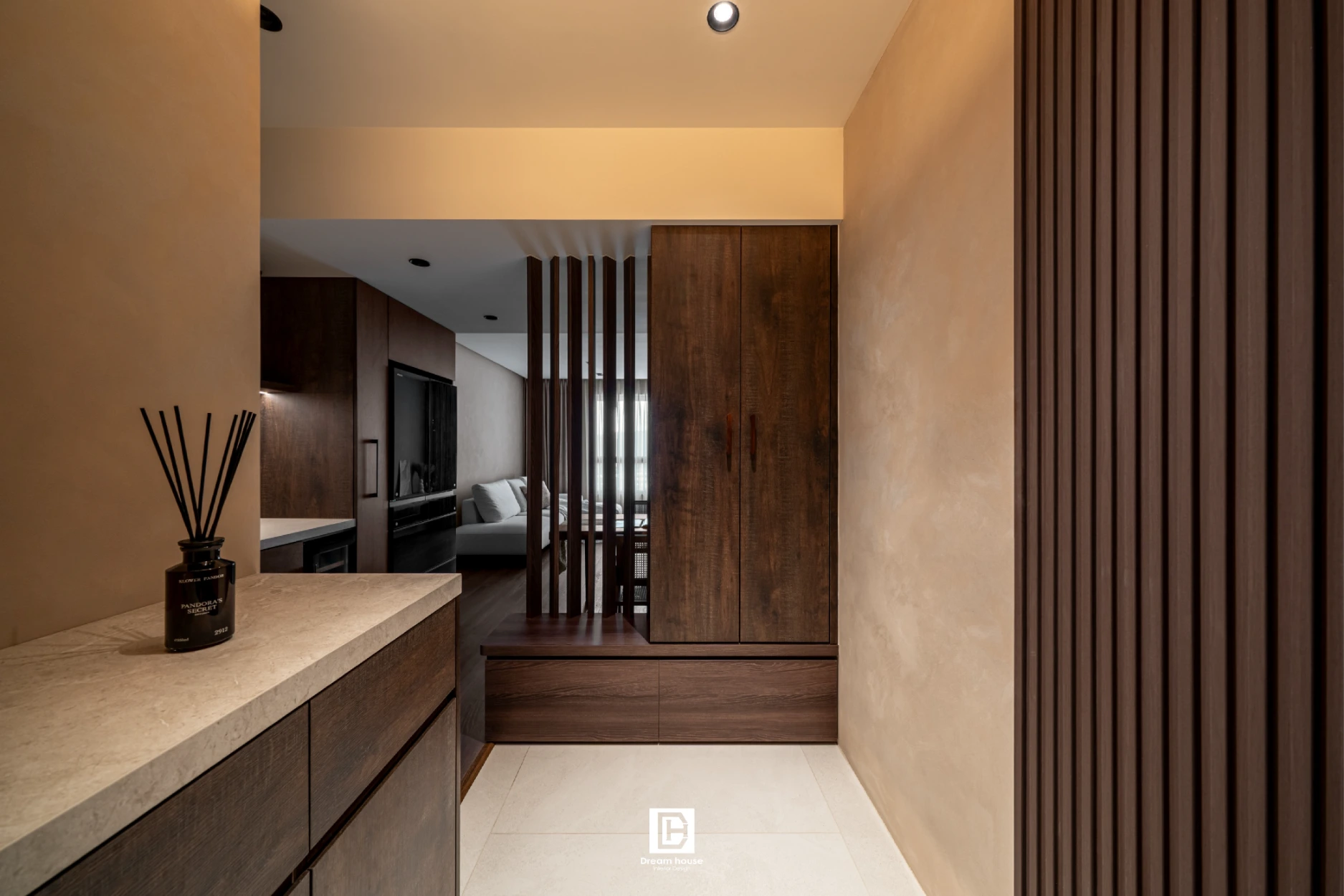 玄關後方以不規則格柵做為屏蔽,除了化解穿堂煞外,配置收納抽屜,讓不規則線條隨戶外光影產生豐富變化。